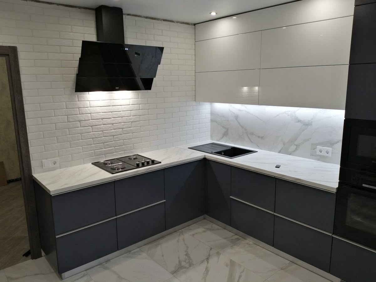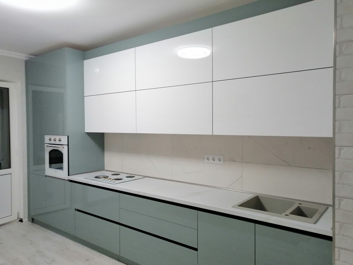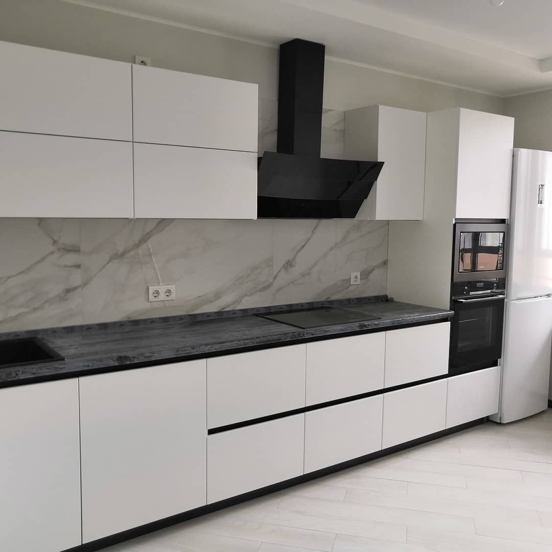 HPL-пластик, нанесенный сверху влагостойких плит МДФ, гарантирует прочность и эстетичность кухонных фасадов. Варианты покрытия включают как гладкую матовую поверхность, так и блестящие глянец-эффекты; рисунок может варьироваться от простых монохромных решений до эффектных копий натуральных фактур: древесины, мрамора, кирпича.